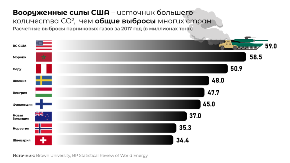 Во всех этих случаях речь идет о локальных изменениях природных ландшафтов. Вопрос же в том, можно ли оценить глобальное воздействие войн и оборонного комплекса разных стран мира на окружающую среду — и прежде всего на климат Земли. Согласно приблизительным расчетам Scientists for Global Responsibility, вооруженные силы всех стран могут быть ответственны за 6% мировых выбросов — это больше, чем гражданская авиация и морские перевозки вместе взятые. Для более точных оценок сейчас не хватает информации: отчеты по военно-промышленным выбросам в в тексте Парижского соглашения значатся как добровольные, и многие страны просто не сообщают этих данных. Но незасекреченная информация позволяет сделать некоторые заключения.