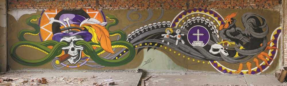 Первыми получились два граффити на тему вуду: дух-лоа Барон Суббота и африканская колдунья-мамбо, которая призывает его. Так они и расположены: друг напротив друга. Панно с бароном растянулось на весь торец цеха, метров на 18, и мы над ним несколько недель трудились в свободное время. Почему вуду? А я как раз вернулась с ролевки, где эту самую колдунью играла. Перед этим пришлось много читать, и тема была очень близка.