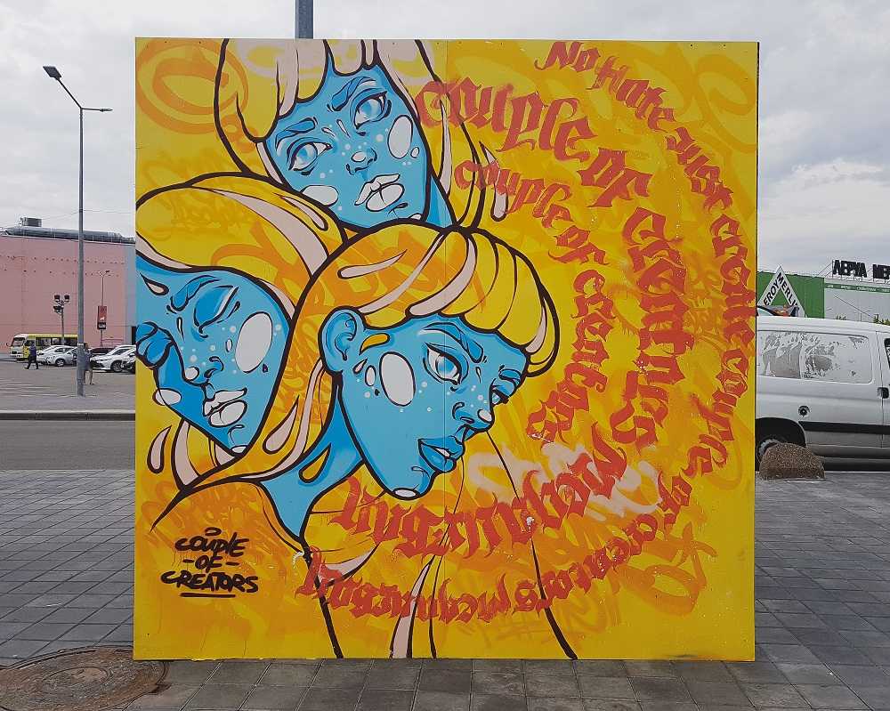 В начальных классах мама разглядела во мне творческие способности и отдала в художественную школу, в которой я проучилась три года. В районной школе всегда активно участвовала во всех художественных мероприятиях и занималась с преподавателем ИЗО. В 10–11 классах перевелась в 35-ю гимназию с художественным уклоном, окончила ее в 2013 году и поступила в Академию архитектуры и искусств ЮФУ на дизайн. В 2017 г. получила красный диплом и отправилась в свободное творческое плавание. В общем, другого пути для себя я не видела и не желала. Граффити заинтересовалась в старших классах, так мы и познакомились с Ваней. С ним я буквально научилась держать банку в руке, а он со мной – кисть. Мы коренные ростовчане, вместе уже почти восемь лет. Занимаемся всем, что так или иначе связано с творчеством, приносит нам удовольствие и возможность жить. Дали начало совместным экспериментам в 2018 году и назвали свой союз Couple of creators. Основой нашего дела является взаимодействие иллюстрации, каллиграффити и граффити. В поисках новых образов мы совместили то, чем занимаемся много лет, умеем лучше всего и любим всем сердцем – рисунок и шрифт. Не пропускаем граффити-мероприятия нашего города.