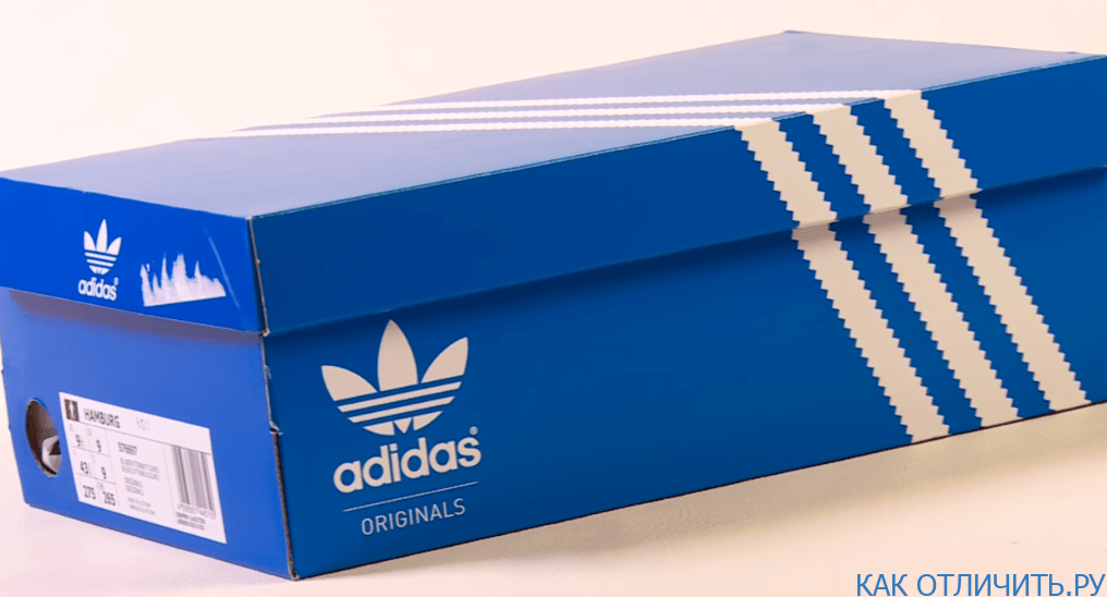Начинать рассматривать особенности модели нужно с ее упаковки, т.е. коробки. Коробка оригинала бывает либо черного цвета с атрибутикой марки Adidas, либо голубого цвета. Обязательно должна присутствовать фирменная наклейка, на которой отчетливо видны следующие детали :