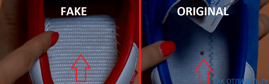 Если вынуть стельку, то в подделке вы не обнаружите отверстия в подошве. В оригинале отверстие есть.