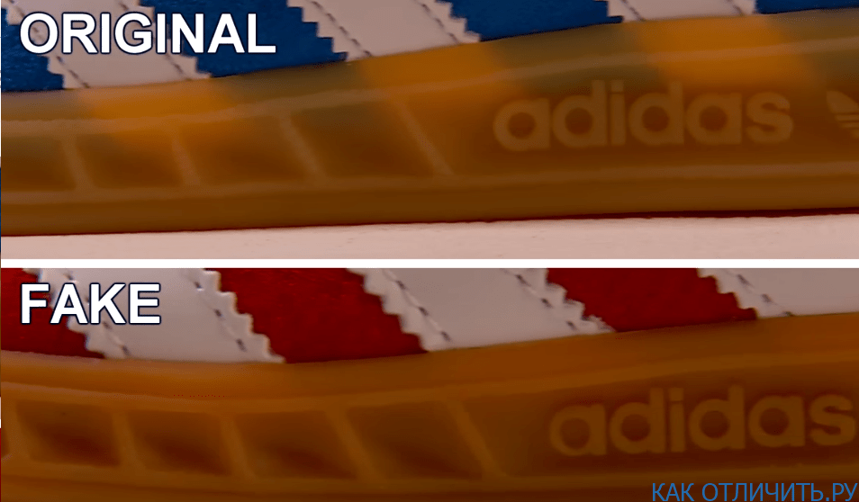 Рисунок подошвы у оригинала и подделки совпадает, отличается только цвет.
