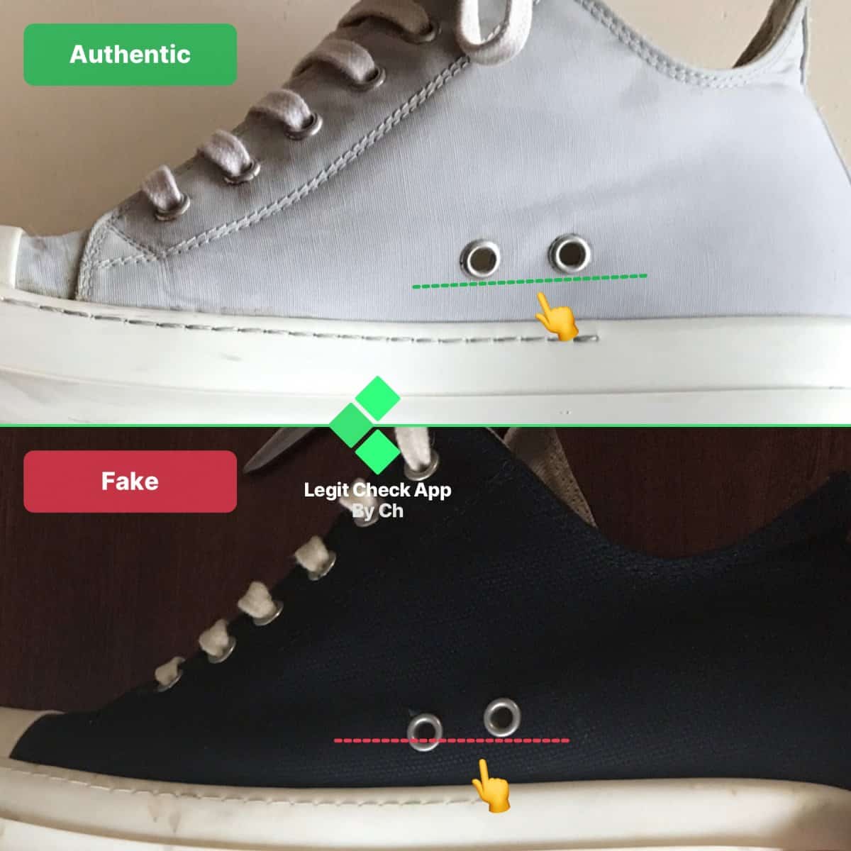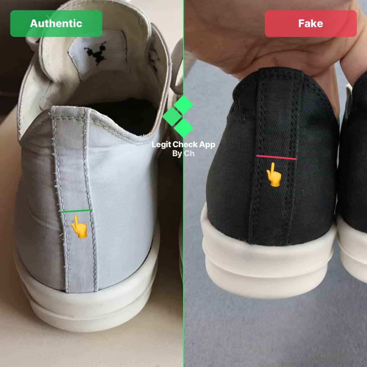 Теперь, когда вы знаете, как распознать поддельные кроссовки Rick Owens DRKSHDW, проверив швы и область носка, мы продолжим сравнение поддельных и настоящих кроссовок DRKSDHW от Rick Owens, проверив детали задней части обуви.