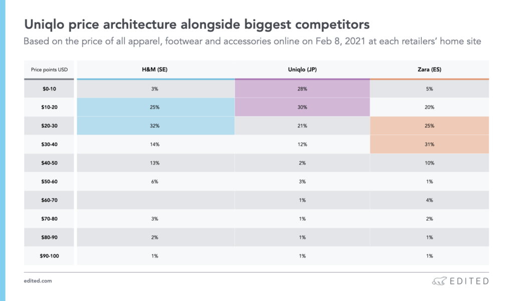 Ценовая политика. Ценовое позиционирование Uniqlo — вообще штука уникальная: 28 % ассортимента из ценовой категории — товары до 10 баксов. Это даже дешевле, чем в Zara, у которой ценник скачет в диапазоне от 20 до 40 зелёных. Только 10 % мужского и женского ассортимента в Uniqlo стоит больше $50 по сравнению с 18 % у Zara.