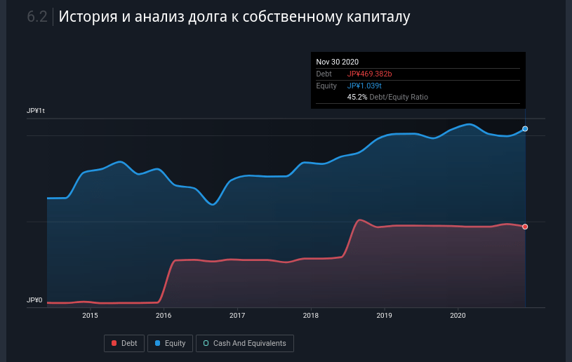 Соотношение прибыли к долгам тоже очень даже прекрасное. Чистая прибыль растёт, долги — сокращаются.