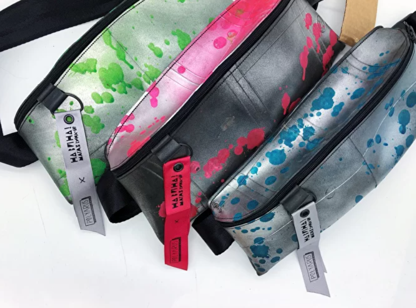 Из баннеров, которые раньше использовались Генеральным консульством Финляндии, 99RECYCLE сделали большие и маленькие шоперы, поясные сумки и пеналы. На каждом экземпляре — бирка из переработанного пластика HDPE