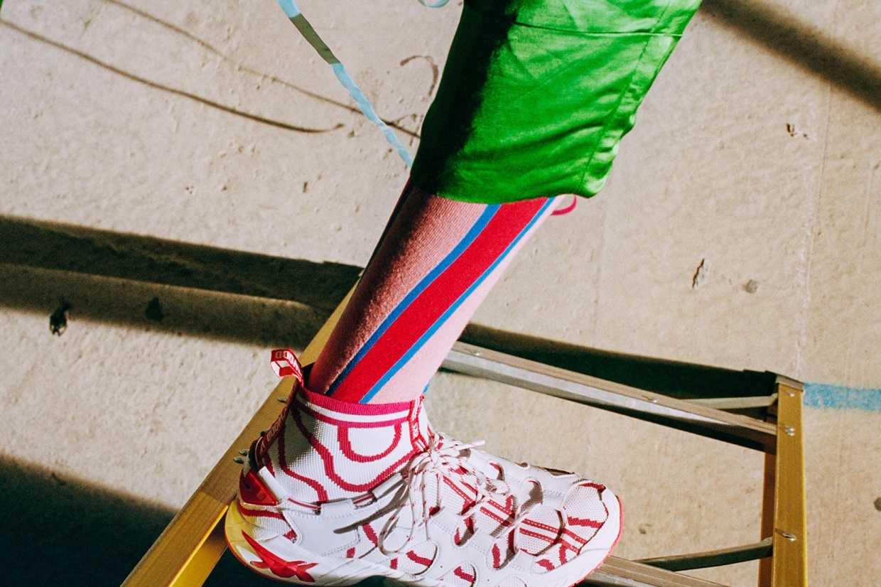 Материал GEL-Mai Knit прекрасно подходит для нанесения принтов, что и было использовано в коллаборации с Вивьен Вествуд. Вся поверхность оказалась покрыта принтом «squiggle», ставшим визитной карточкой Вивьен после дебютной коллекции в сезоне осень-зима 1981. Сам эластичный носок сделан интарзийным методом, когда каждый цвет представляет собой точно отмеренный отрезок нити. Завершают образ белые кожаные вставки и логотип Vivienne Westwood на заднике.