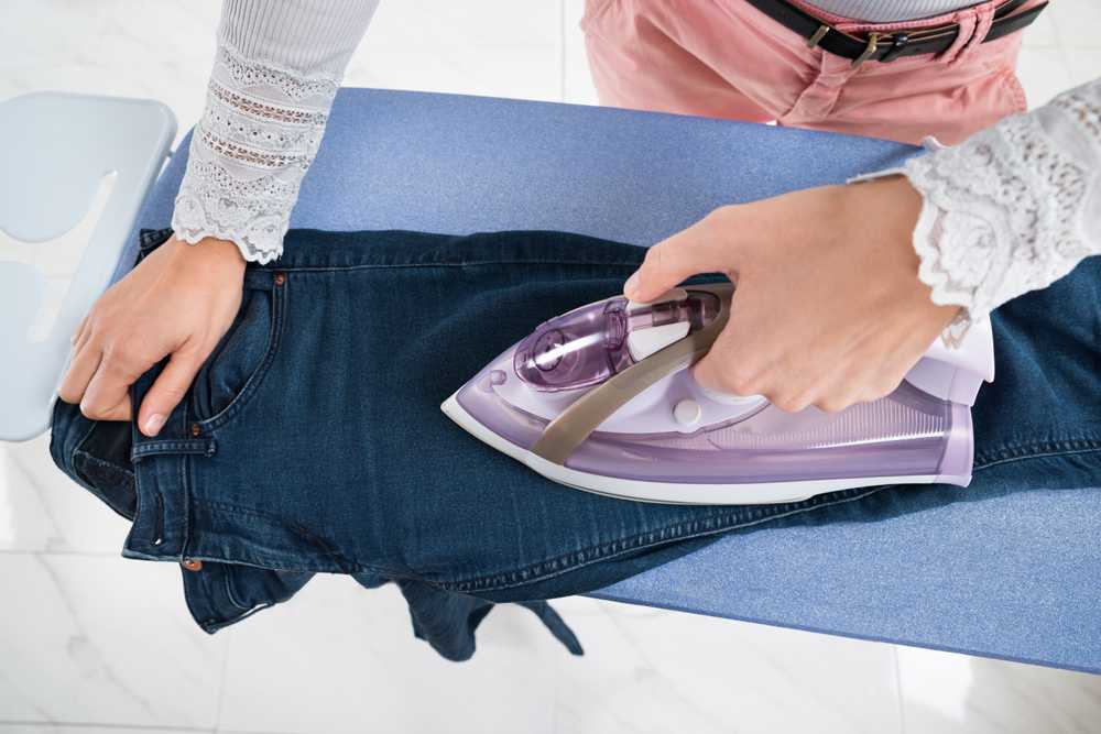 - Не нужно гладить сухие вещи из денима. Желательно не дожидаться полного высыхания, но если это случилось, воспользуйтесь пульверизатором. Чтобы избежать лишних складок, гладьте со стороны изнанки.