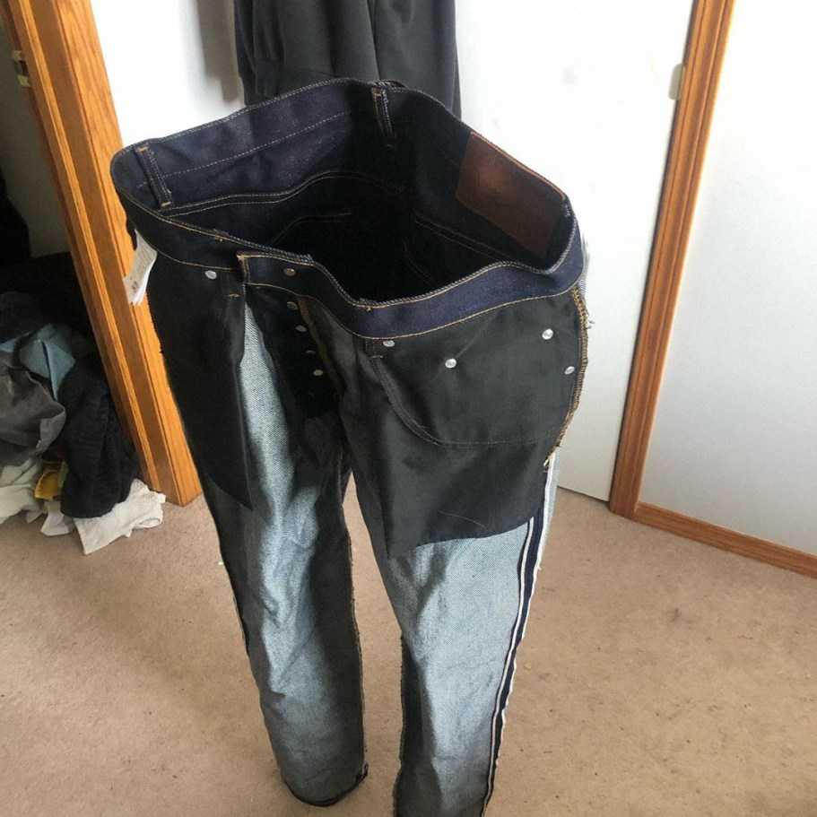 Рационализатор Джейкоб Девис усовершенствовал брюки, предложив закрепить карманы при помощи медных заклепок. Такой вариант брюк пришелся по душе сначала жителям западных штатов, а после и всей страны. Ареал нового материала расширился после того, как «неубиваемые» штаны приобрели темно- или светло-синий цвет. Само полотно назвали «деним», что в переводе с французского значит «из Нима», имея в виду провинцию, где создавалось это прочное полотно.