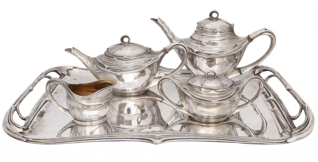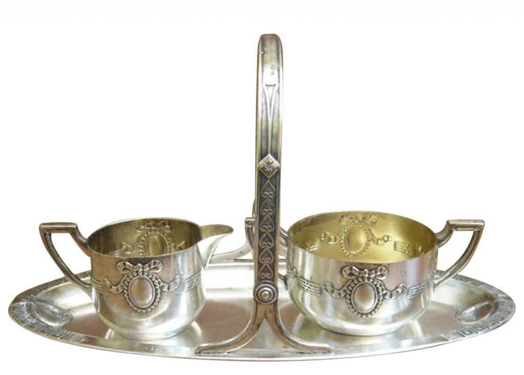 Изготовлено в 1920-х годах в Австрии. Молочник и сахарница на подносе.