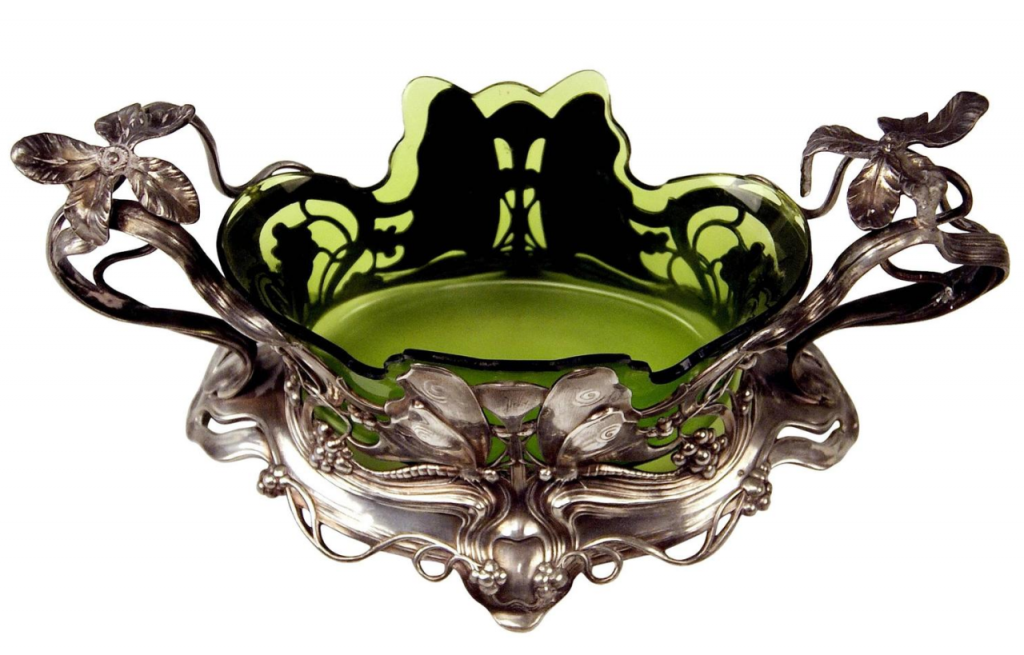 1905 г. Ваза из цветного стекла с обрамлением из металла Britannia, выполненным с растительными