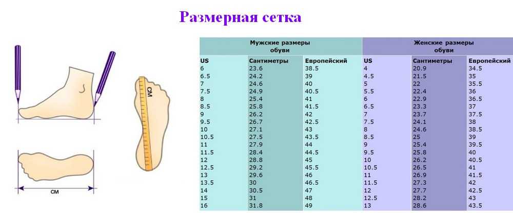 | Российский размер (RU) | Европейский размер (EUR) | Британский размер (UK) | Длина стопы (см) |