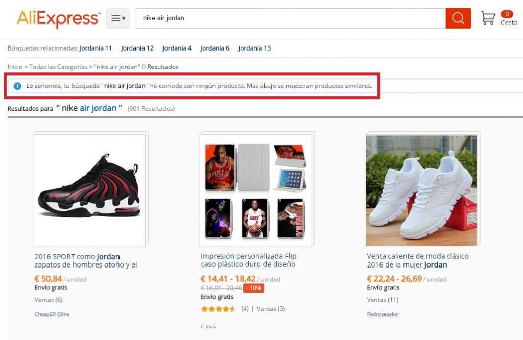 Проблема в том, что в течение долгого времени продавались только реплики, и AliExpress еще не отменил некоторые из мер «против реплик», которые были у него, когда все проданные Nike Air Jordans были подделками. Самым очевидным (и раздражающим) является то, что большую часть времени, когда вы будете искать «Nike Air Jordan », вы увидите такой результат: