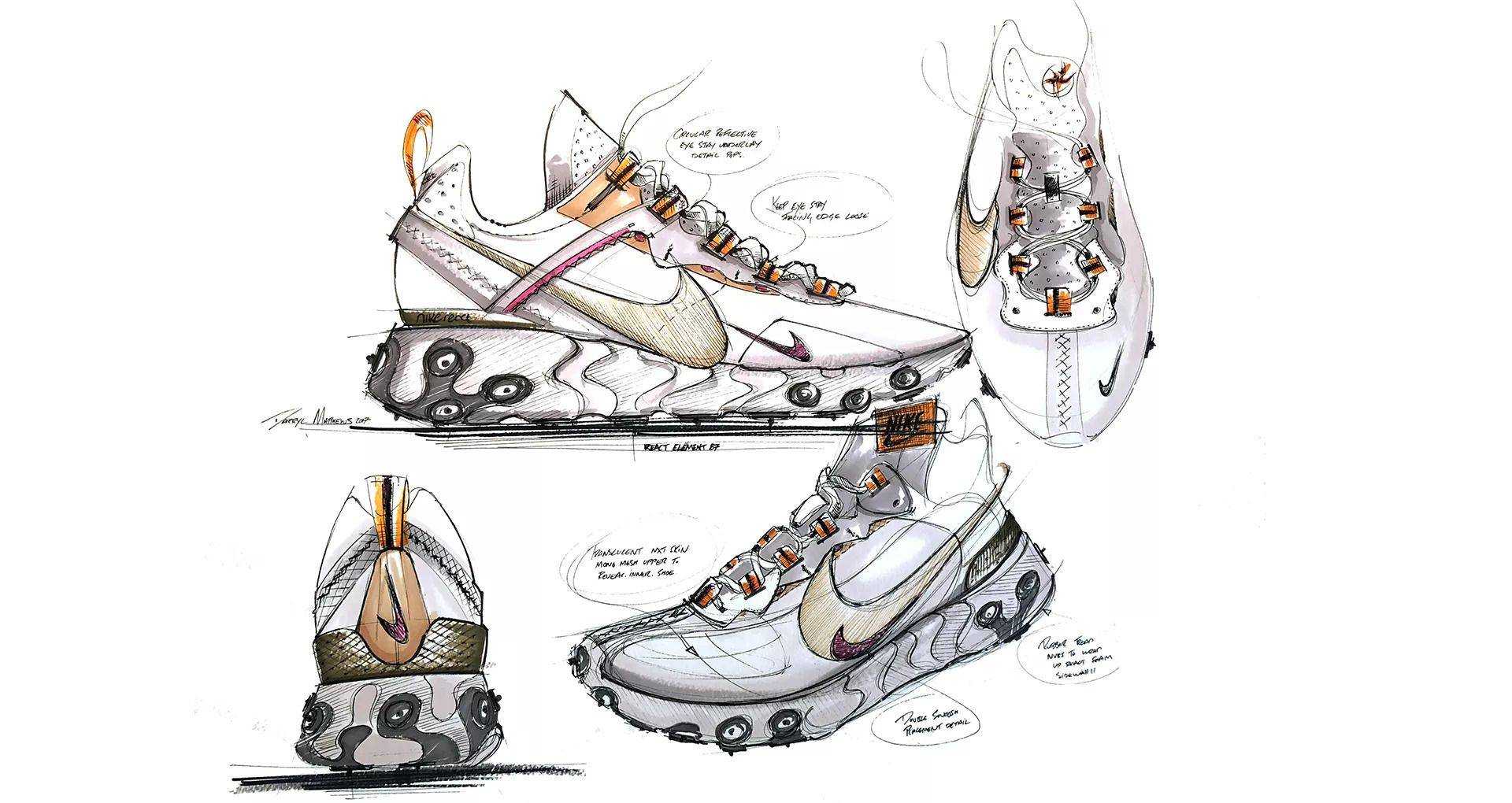 Расчёты помогли выбрать самый эффективный паттерн и сохранить его свойства для любого размера кроссовок. Затем Дэррил сделал эскиз с новой подошвой и в то же время сформировал дизайн верхней части для кроссовок Nike React Element 87. Он вдохновился популярным беговым силуэтом Nike Internationalist родом из начала 80-х. Из него Дэррил Мэтьюз взял элементы задника, мыска и язычка, а остальное — включая уникальный полупрозрачный верх и асимметричность — из Nike Zoom Fly SP 2017.