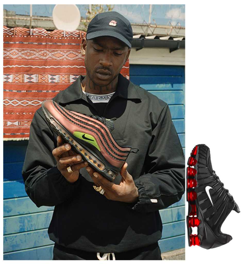 В отличие от Stormzy, Skepta остался верен корням грайма и «свушу». На счету рэпера уже четыре модели кроссовок с Nike: Air Max Deluxe, Air Max 97 / BW, Air Max 97 и Shox TL с кроваво-красной подошвой, которую артист называет своей самой личной парой.