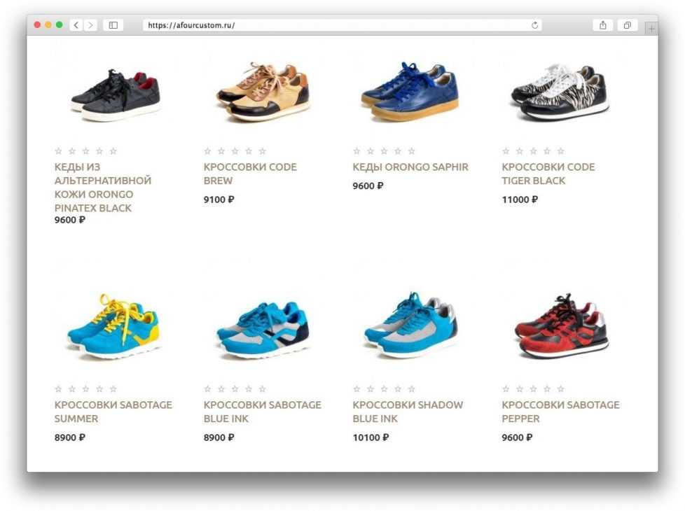 Это обувь ручной работы, которую шьют по индивидуальным меркам. В каталоге есть готовые модели кроссовок, ботинок и зимней обуви, а их дизайн можно придумать самому — а точнее, собрать в онлайн-конструкторе: выбрать цвет шнурков или подошвы, материал союзки. Обувь AFOUR шьют из натуральной кожи и альтернативной веганской кожи из листьев ананаса, в линейке представлены велокроссовки, ботинки для хайкинга, а также кеды, челси, броги и кроссовки для повседневной носки.