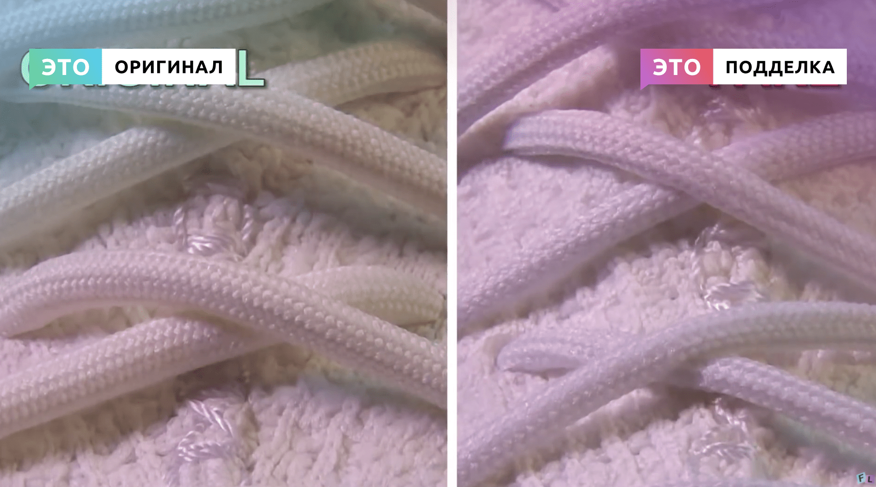 Поддельные шнурки слишком мягкие. А оригинальные плотные и жёсткие. Узор на шнурках отличается от рисунка волокон ткани, из которой пошиты сами кроссовки. Он напоминает крест. У цветных вариантов шнурки немного светлее, чем ткань самой обуви.