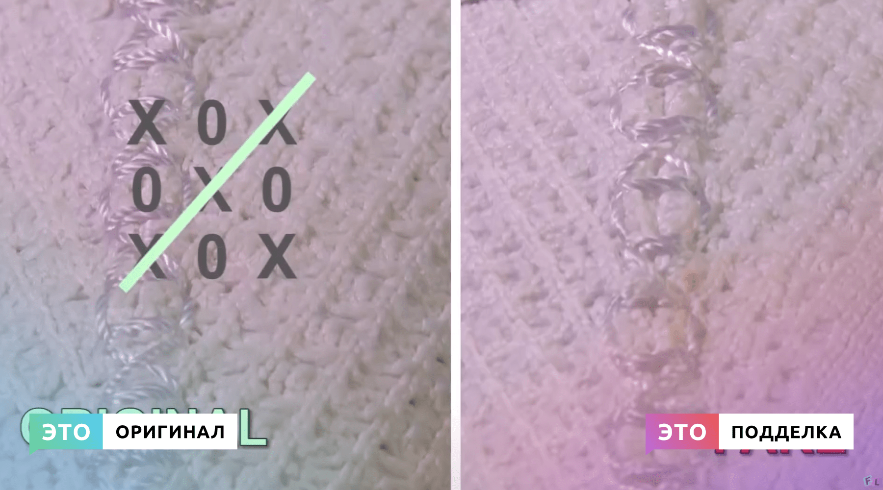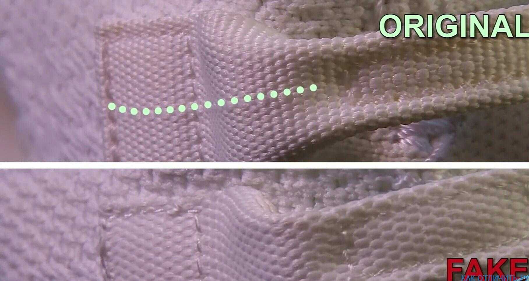 У оригиналов прослеживается чёткий прямоугольный блок по бокам. Хотя тканый узор у фейков белого цвета очень схож с оригинальным.