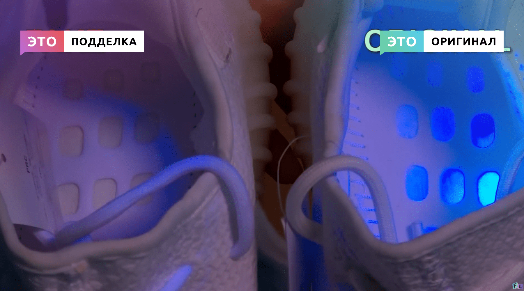 - Внутренняя часть обуви под стелькой будет светиться, а у подделки нет.Проверка под ультрафиолетом подделки