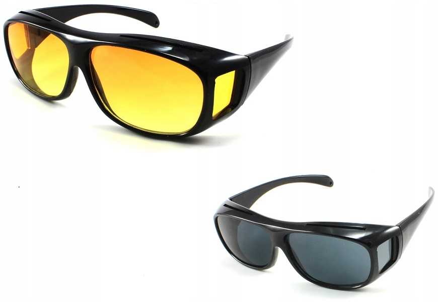 В комплекте производитель положил 2 очков – стандартные солнцезащитные и водительские. Оба варианта можно надевать поверх обычных очков для зрения.