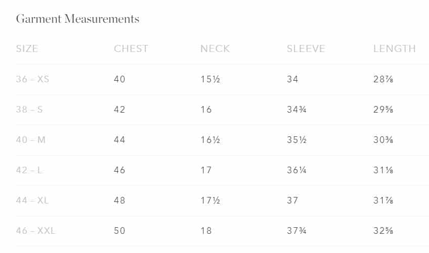 The founders of the brand suggest buying your jacket size. For example, if you wear a size 40 jacket, buy a size 40 shirt. This Taylor Stitch clothing review includes size charts for you: