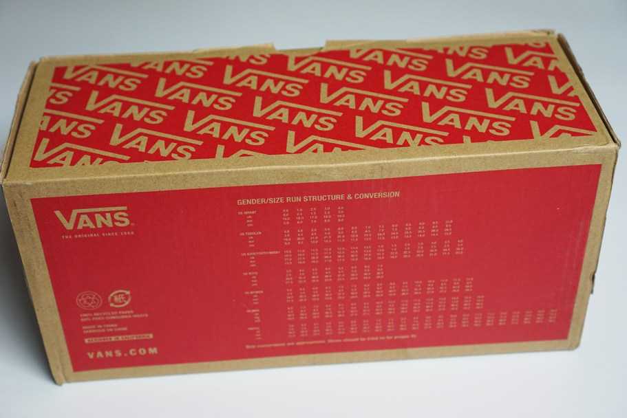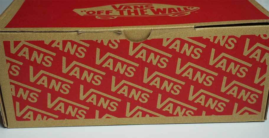 На больших боковых поверхностях коробки кед много раз изображен логотип слово VANS. На двух других частях дана информация для идентификации по маркировке (штрих-код, артикул и номер партии), размерному ряду и месту производства.