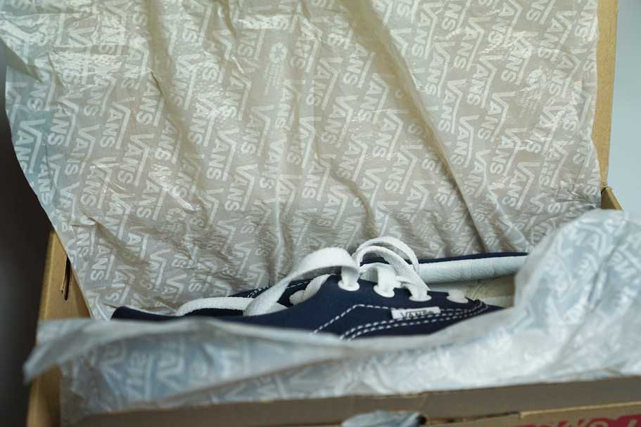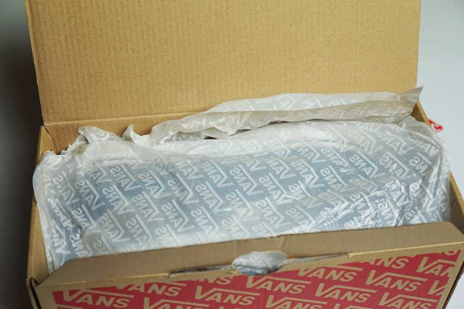 После открытия коробки важно обратить внимание на дополнительную упаковку. Кеды завёрнуты в папирусную упаковочную бумагу. На ней есть дублирование слова «VANS»