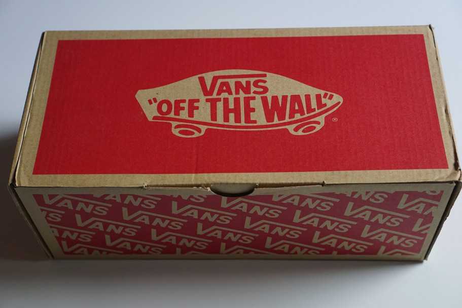 Кеды Ванс упаковывают в крафтовую коробку. Ее поверхности покрыты красным или черным цветом. На верхней части нарисован скейтборд и на нем надпись VANS «OFF THE WALL». Крышка коробки имеет язычок-замочек. Внутри на правой стороне указаны размер упаковки и модель.