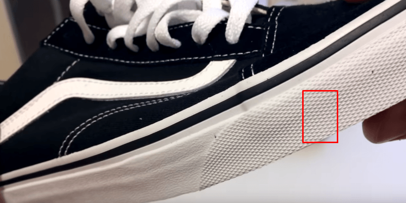 - Сзади на кедах есть лого в виде прямоугольника. На нём нарисован скейт, написано «VANS», «Off the wall». Размещают прямоугольник на торце подошвы.