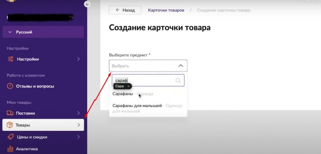 - создаете карточку — выбираете предмет из готового списка (сарафаны, брюки, аксессуары);