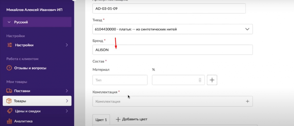 заполняете остальные поля — пол, страна, Тнвэд, цвет, артикул, комплектация и т. д.