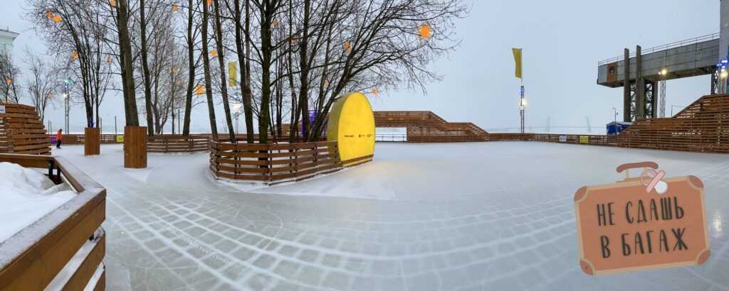 Небольшая ледовая площадка с искусственным покрытием размером 20 на 40 м традиционно открывается в конце декабря и работает до начала апреля, насколько позволяет погода. Каток работает каждый день с 10:00 до 22:00, по пт. и сб. заезды продолжаются и ночью до последнего посетителя. Время катания разбито на сеансы по 60 мин., стоимость билета для взрослых от 300 до 450 руб., для детей до 13 лет — от 200 до 300 руб., в зависимости от дня недели. В пункте проката предлагают коньки от 26 до 48 размера, стоимость их аренды — 300 руб./час + возвратный залог 1000 руб. Заточка — 200 руб. Владельцам карт Тинькофф при оплате любой из услуг предоставляется кэшбэк 50%. Рядом с катком имеется фудкорт и парковка.