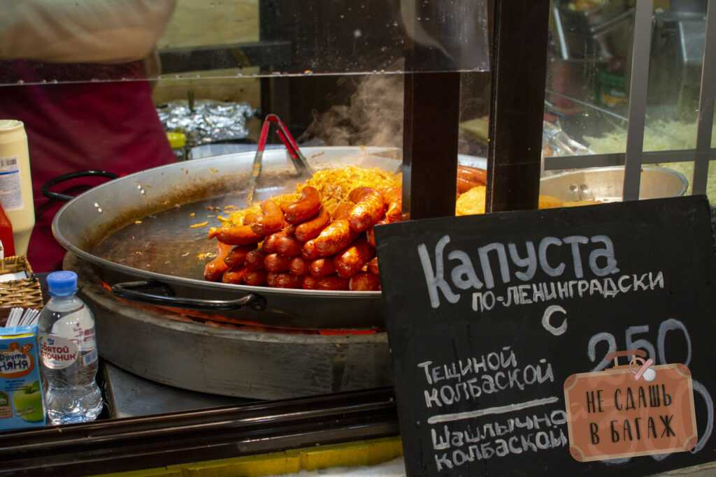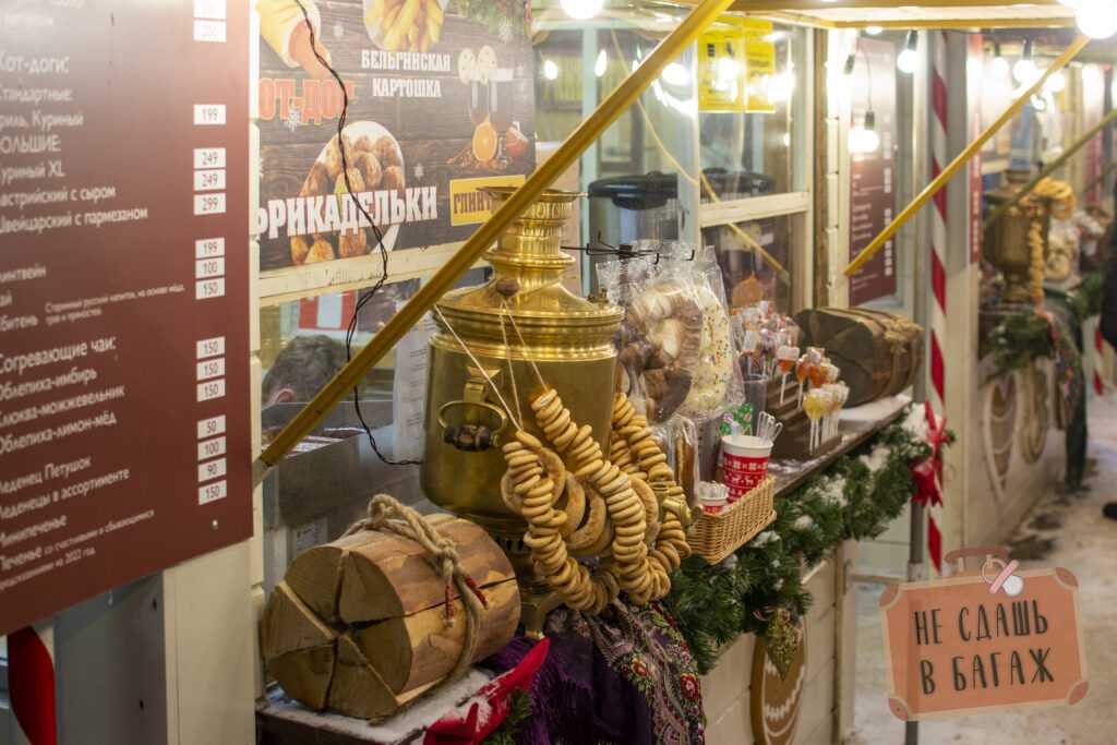 Много-много ларей с традиционными праздничными блюдами разных кухонь мира: во главе угла опять Чехия, вот уж тренд. Капуста с колбасками, чешский гриль, согревающий глинтвейн (правда исключительно безалкогольный), чаек из самовара c баранками.