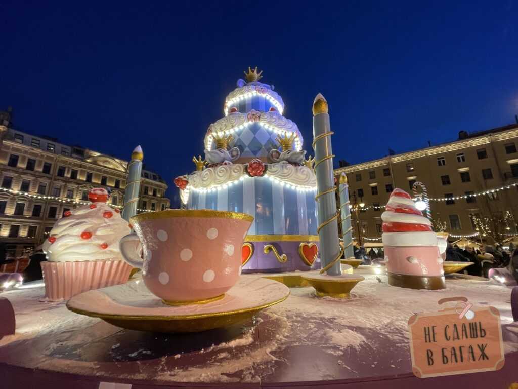 Это удобно, не нужно никуда ехать: гуляешь по Невскому, зашел погрузиться в праздничную атмосферу, а тут еще и бесплатные развлечения. Каток, где вам и коньки безвозмездно выдадут. Красивая каруселька, мимо которой не пройдет ни один ребенок. Паровозик, курсирующий вокруг огромного мышиного торта, тоже порадует деток. Даже ребята в гусарских костюмах предлагают сфоткаться на память без скрытых условий =)