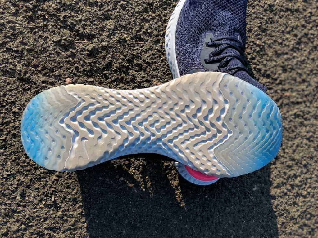 Протектор кроссовок Epic React является единственным местом подошвы, где у меня остались некоторые оговорки. Более прочная, чистая резина размещена только сзади пятки и перед мыском, больше позволяя увеличить сцепление, чем износостойкость. И меня беспокоит срок службы этой обуви, учитывая площадь открытого среднего слоя. Протектор с открытым средним слоем выглядит, как произведение искусства, а гладкие линии и контуры белой пены среднего слоя придают этой обуви эстетически привлекательный вид.
