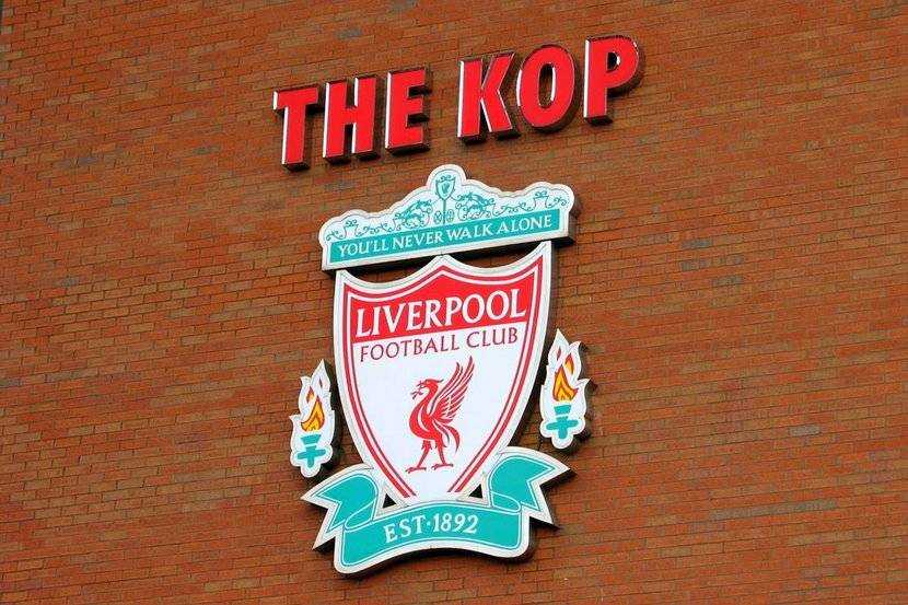 Эмблема Ливерпуля расположенная на фасаде стадиона