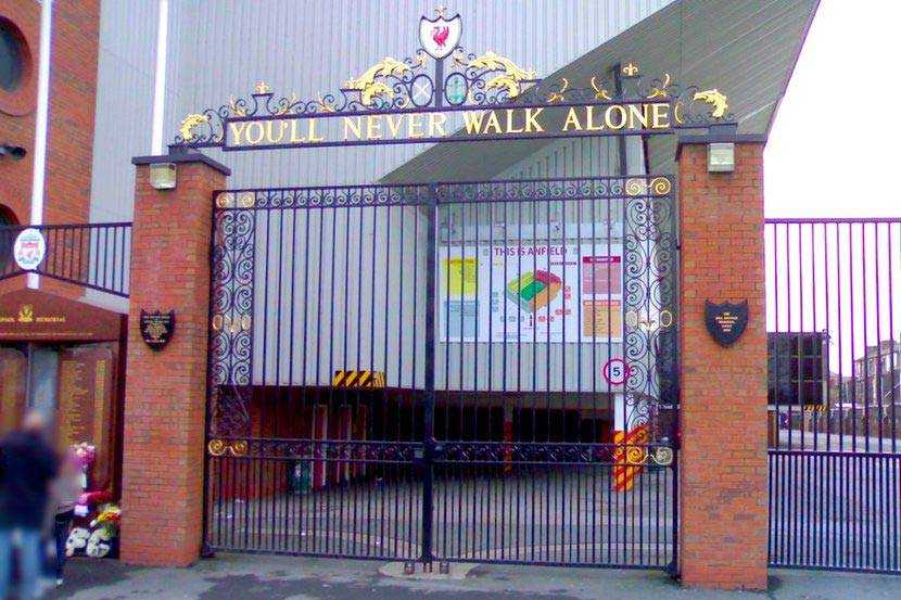 Ворота Шенкли. Надпись на воротах «You’ll Never Walk Alone» (переводится как «Ты никогда не будешь один»)