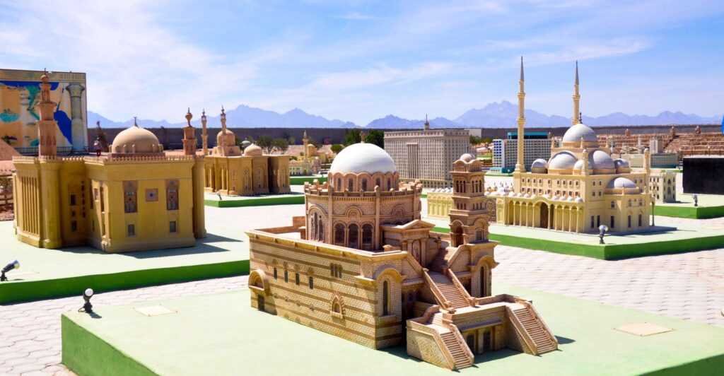 В парке представлены миниатюрные модели многих культовых зданий. Например, вы можете увидеть пирамиды Гизы, великий храмовый комплекс Луксора и многое другое, всего коллекция состоит из более чем 60 произведений. Разумеется, это не идет ни в какое сравнение с оригиналами, но для общего представления о архитектуре, особенно с детьми, это место стоит посетить, да и для забавных фото тоже.