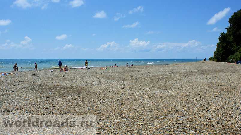 Здесь комфортно ходить босиком по мелкой гальке с песком. Ширина пляжа варьируется от 15 до 30 метров. Море на этом участке чуть холоднее из-за впадающей реки Агура. Кстати, из-за близости с рекой, здесь лучше не останавливаться после ливней, поскольку приносит мутную воду с гор.