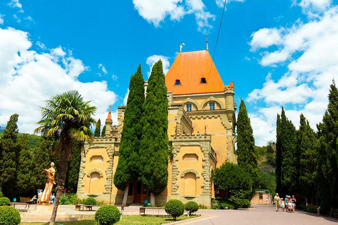 В зелени стройных кипарисов в селе Утес, неподалеку от Алушты виднеется оригинальная архитектурная достопримечательность, напоминающее средневековый замок. Это известный в Крыму дворец княгини Гагариной. История его возникновения романтична и печальна. Это воплощение мечты любящей женщины в память о безвременно ушедшем муже и об их любви.
