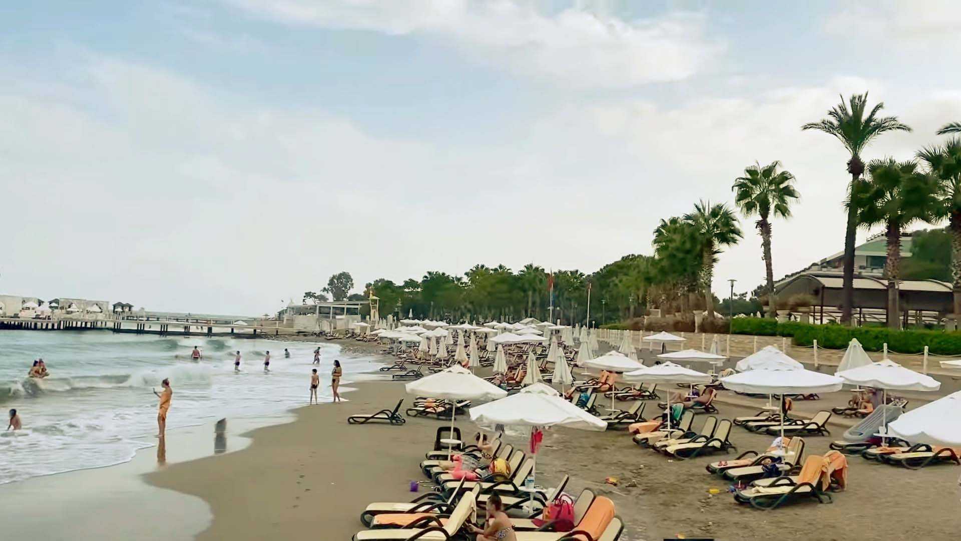 В самом городе Кемер пляж тянется вдоль всей береговой линии от причала Turkiz Marina, здесь средняя и крупная светлая галька (кто был в Ялте — здесь очень похожие камушки) и нет свободного места почти нигде, все заставлено плотными рядами шезлонгов вдоль моря. Этот пляж Кемера узкий, из-за чего кажется, что туристы сидят друг у друга на головах. Некоторые отели строят пирсы, чтобы хоть как-то разместить своих многочисленных гостей. Да, людей в сезон здесь действительно много. Вход в море довольно резкий, через несколько метров от берега уже глубоко. Этот пляж Кемера награжден «Голубым флагом», вода очень чистая, видно дно и мелких рыбок. Все-таки, у галечных пляжей Кемера тоже есть плюсы. Море здесь намного чище, чем на песчаных пляжах. Можно даже заняться снорклингом, но нужно отплыть от берега на 5-10 метров.