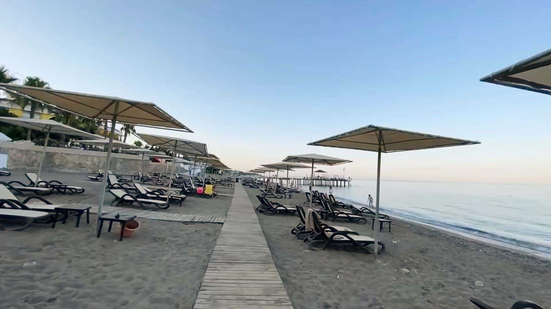 Это всего в 3 км от Сиде, и вы можете дойти до Кумкой, если хотите. На пляже есть все необходимое для полноценного отдыха — шезлонги, зонтики и растянутые крыши. Глубина начинается постепенно, резких перепадов нет.