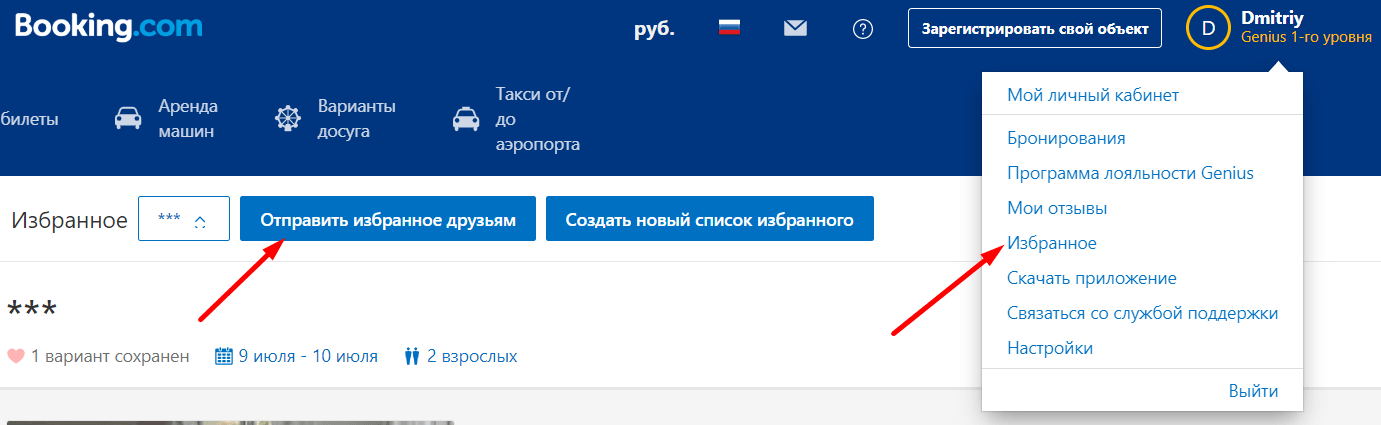 Если кто-либо воспользуется услугами Букинга, перейдя по вашей ссылке, сайт выплатит вознаграждение обоим. Жмем на свое имя в правом верхнем углу, находим “Избранное”. Кликаем на кнопке “Отправить избранное друзьям”, копируем ссылку.