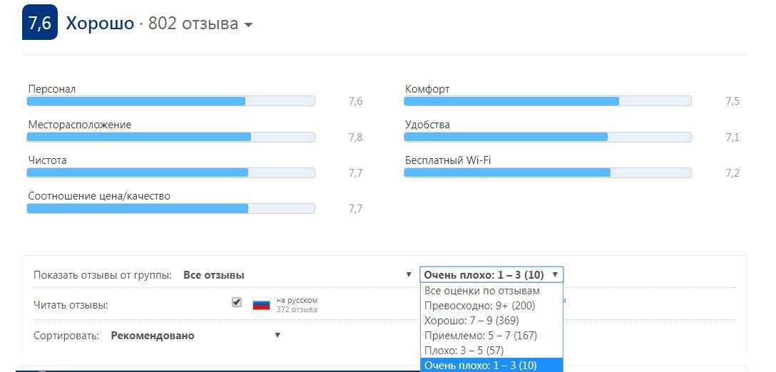 Второе, что я всегда смотрю на букинг – это рейтинг и отзывы. Каждый отель на букинге имеет определенный рейтинг, максимум 10, но такой я пока не встречала. Обычно хорошие отели имеют рейтинг более 8.