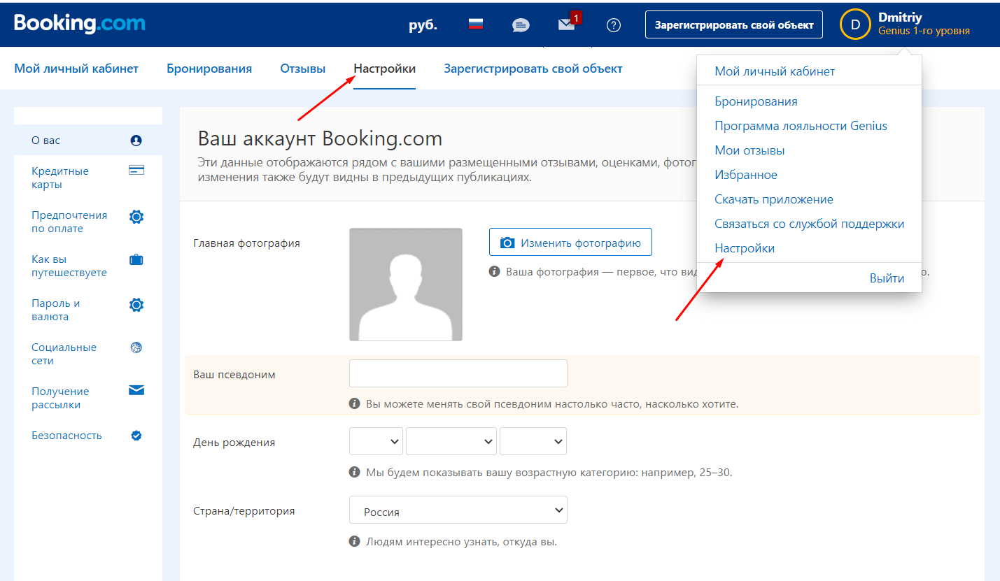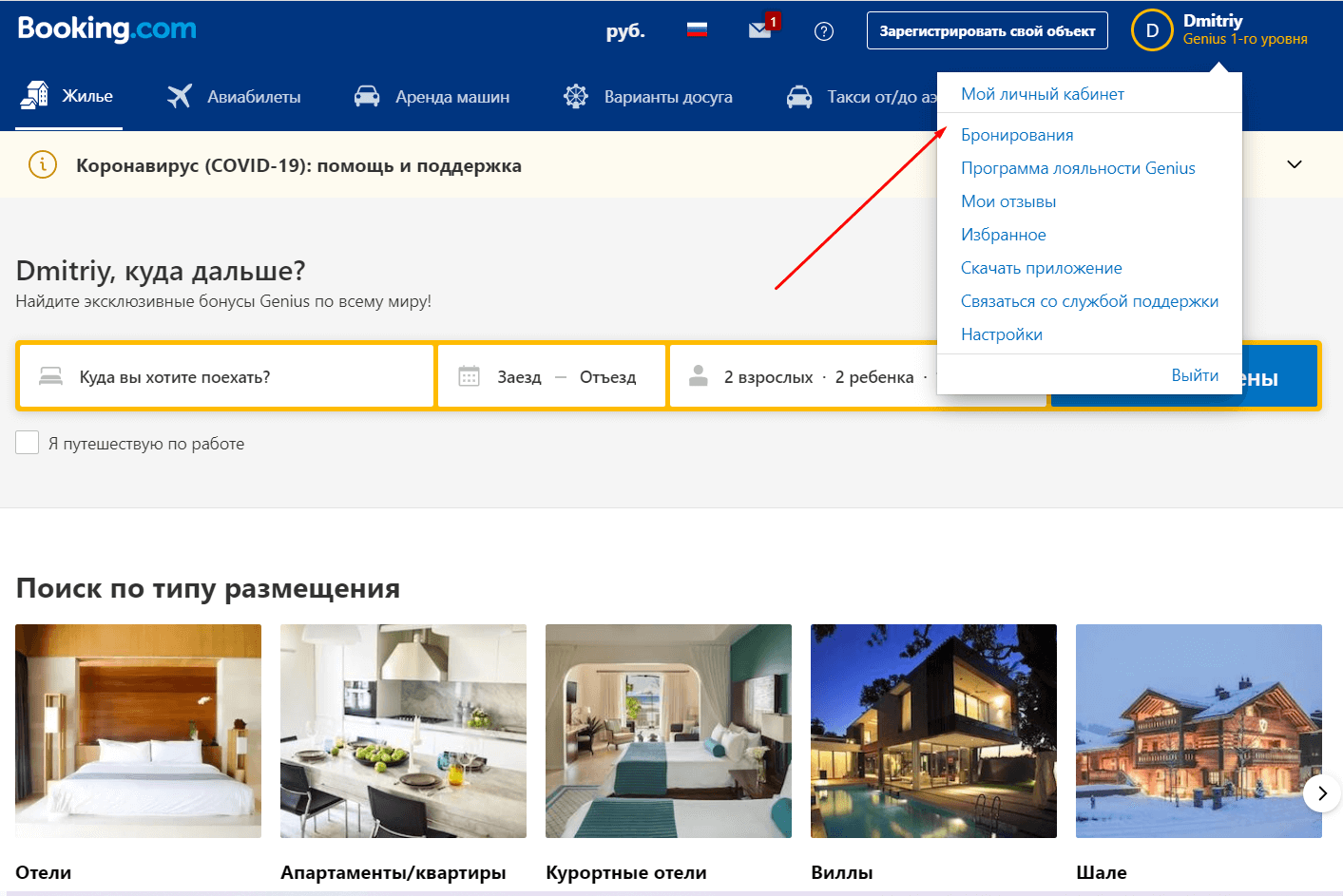 Вот так выглядит действующий аккаунт. Нажимаем на значок или имя в верхнем правом углу, заходим, получаем доступ к своим бронированиям, отзывам, знакомимся с программой лояльности, совершаем другие действия.