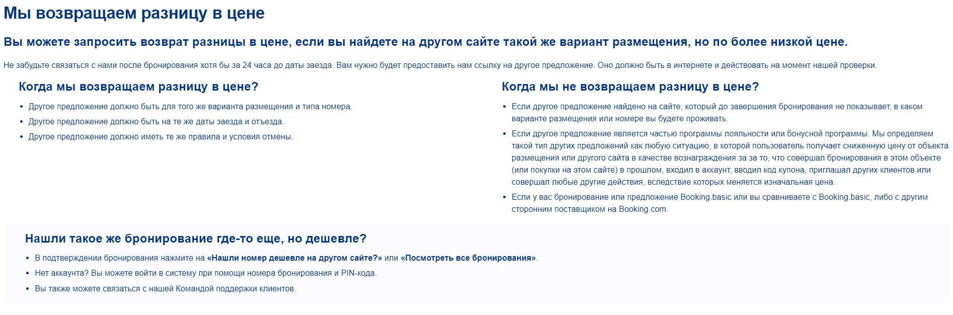 Букинг гарантирует, что арендуемое на его площадке жилье имеет самую выгодную цену. При обнаружении оплаченного объекта проживания на стороннем ресурсе по более низкой стоимости можно обратиться к службе поддержки с запросом компенсации ценовой разницы.