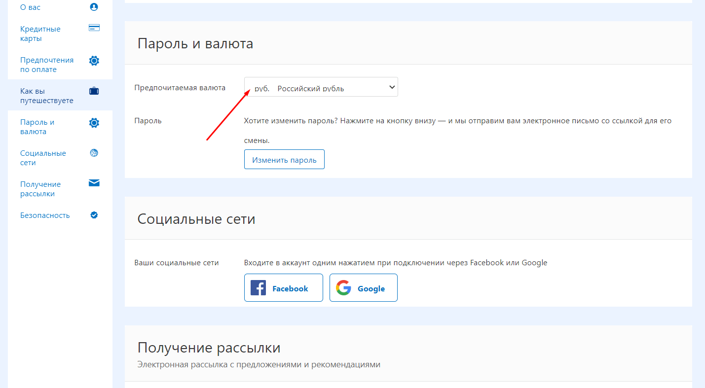 Смотреть цены на букинг можно в разных валютах. Например, в России мне удобно видеть стоимость номера в рублях, а в других странах в долларах или евро. Чтобы сменить валюту найдите сверху страницы значок валюты, как на картинке ниже, и выберите свой вариант.