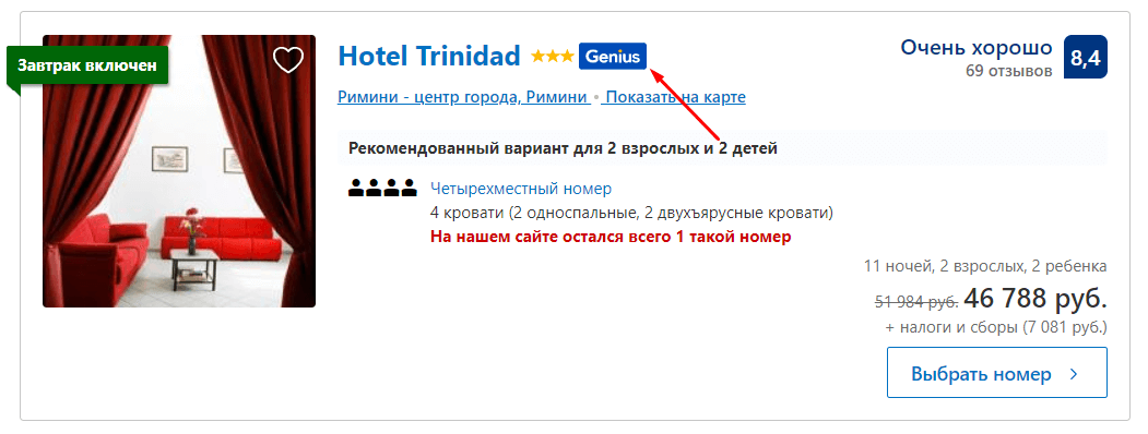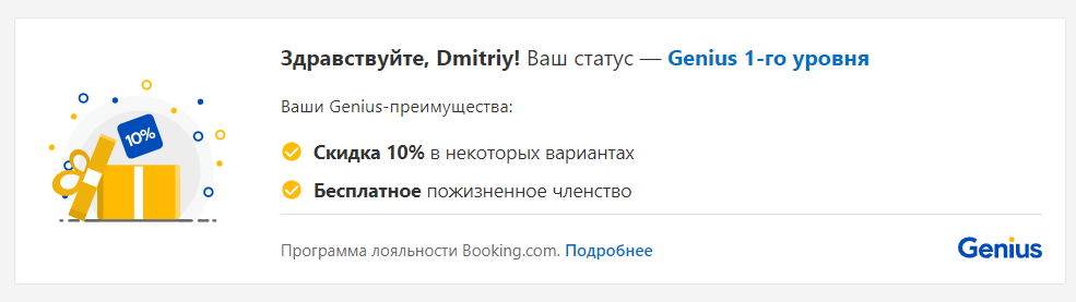 На Букинге действует программа лояльности Genius. Она распространяется на всех зарегистрированных пользователей. Суть ее в том, что после совершения двух законченных бронирований в течение двух лет, путешественник имеет право на скидку 10-15 % при оформлении следующей покупки услуг определенных вариантов размещения. Увеличение бронирований повышает уровень.