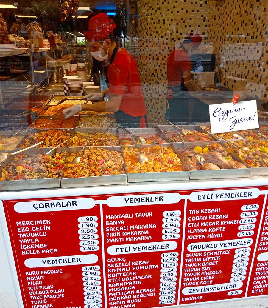 Подходишь к прилавку, тыкаешь пальцем в блюдо, тебе накладывают, а в конце на кассе рассчитываешься. Стоит дешево, но бывают и дорогие lokantasi. Цены всегда можно посмотреть заранее – на входе смотрите меню: если почти все блюда до 10 лир, то будет недорого. В дорогих lokantasi редко вывешивают меню на входе.