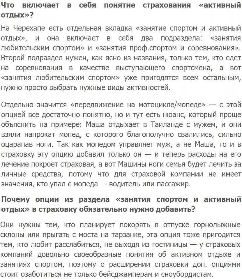 - Травмы, полученные в ходе занятий экстремальными видами спорта, относятся к отдельным страховым рискам. Если клиент практикует активный отдых, при подборе полиса необходимо выбрать конкретные виды спорта, которыми гражданин будет заниматься в поездке (это делается при помощи меню «Занятие спортом и активный отдых» в правой части страницы со списком найденных предложений). Если не сделать этого, компания может отказаться выплачивать компенсацию за травмы, полученные во время подобных занятий.